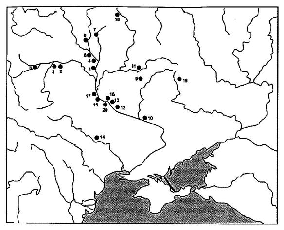 Мапа пам’яток зарубинецької культури зі знахідками предметів озброєння