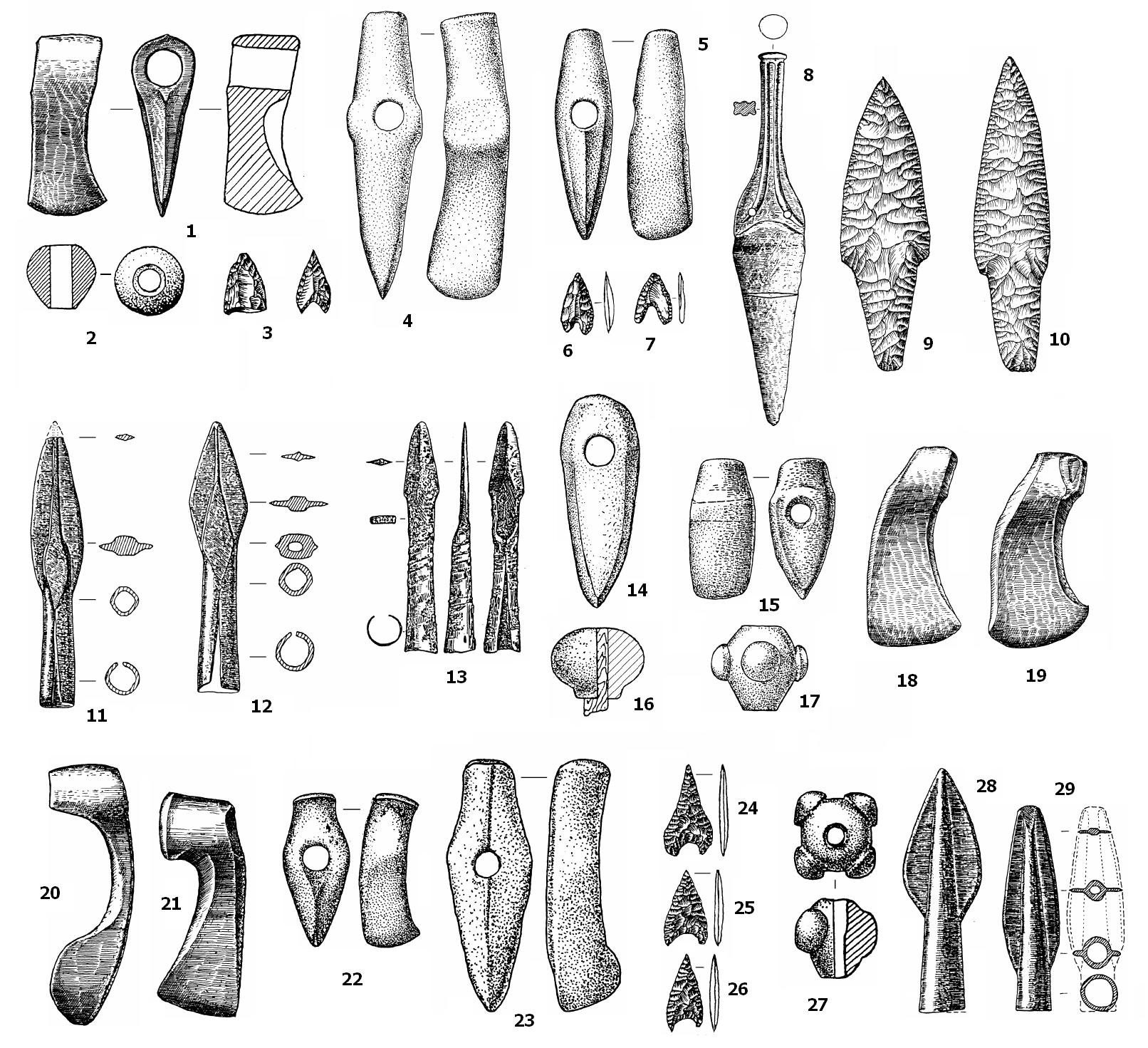Кам’яна та бронзова зброя племен ІІІ тис. до Р.Х. 1–10 – ямна культурно-історична спільність; 11–19 – катакомбна культурно-історична спільність; 20–26 – культури шнурової кераміки; 27–29 – середньодніпровська культура [4]