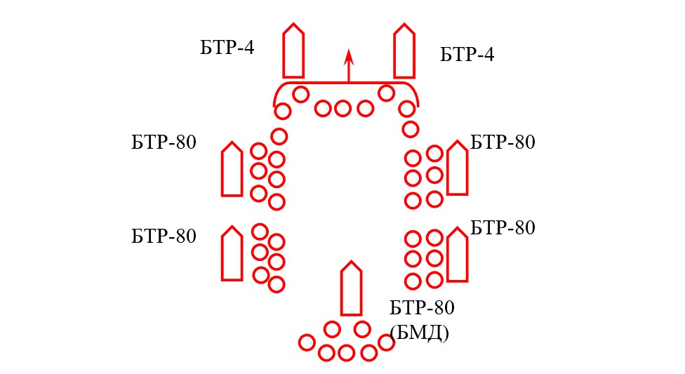 Під час ведення спеціальних дій та просування по вулицях міста, силовики застосовували бойовий порядок “Свиня”, який зображено схематично на малюнку 1.