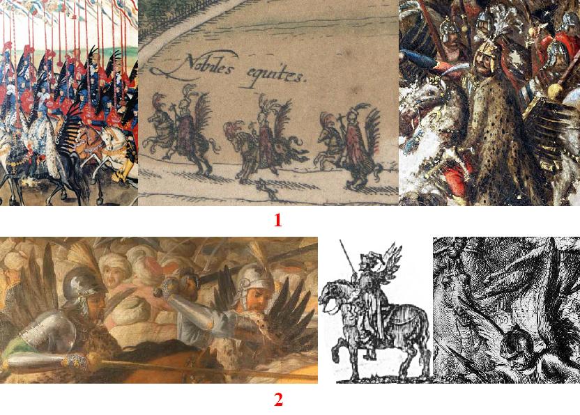 Гусарські "крила" на зображеннях: прямі крила на дерев’яній основі, що кріпилися до сідла (1) і зооморфні крила, що кріпилися до спини (2).