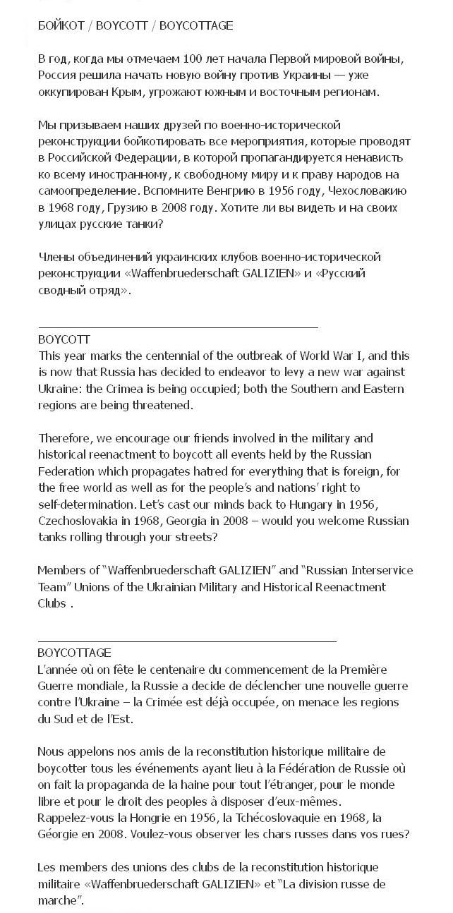 Ми закликаємо наших друзів у військово-історичній реконструкції бойкотувати всі заходи, які відбуваються у Російській Федерації, в якій пропагується ненависть до усього іноземного, до вільного миру та до права народів на самовизначення. Згадайте Угорщину в 1956 році, Челословаччину в 1968 році, Грузію в 2008 році. Чи хочете ви бачити на своїх вулицях російські танки?