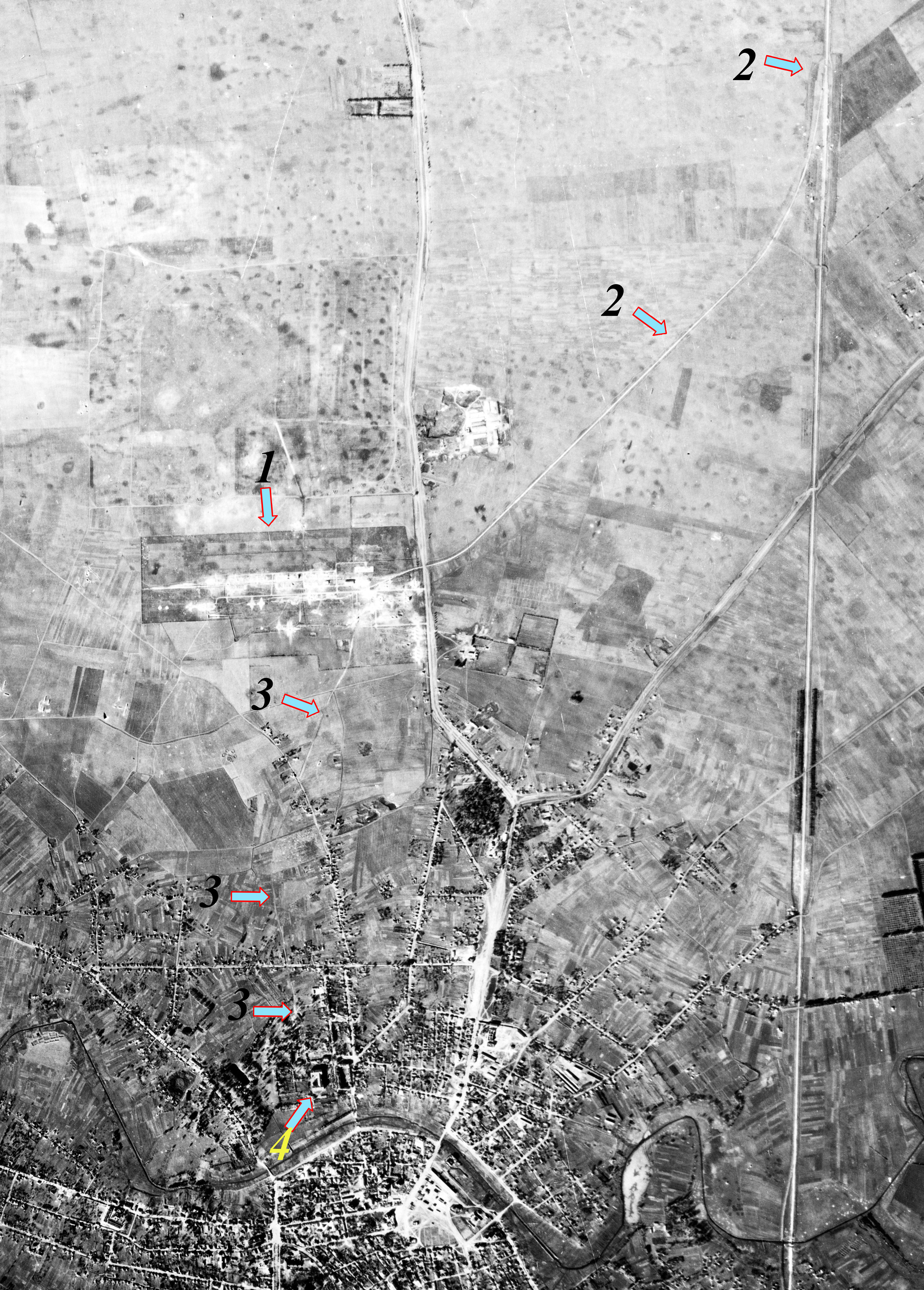 1- Аеродром, 2- Залізнична колія від магістралі Ніжин – Чернігів до аеродрому, 3 – Залізнична колія від аеродрому до шпиталю (інституту), 4 – Будівля інституту.
